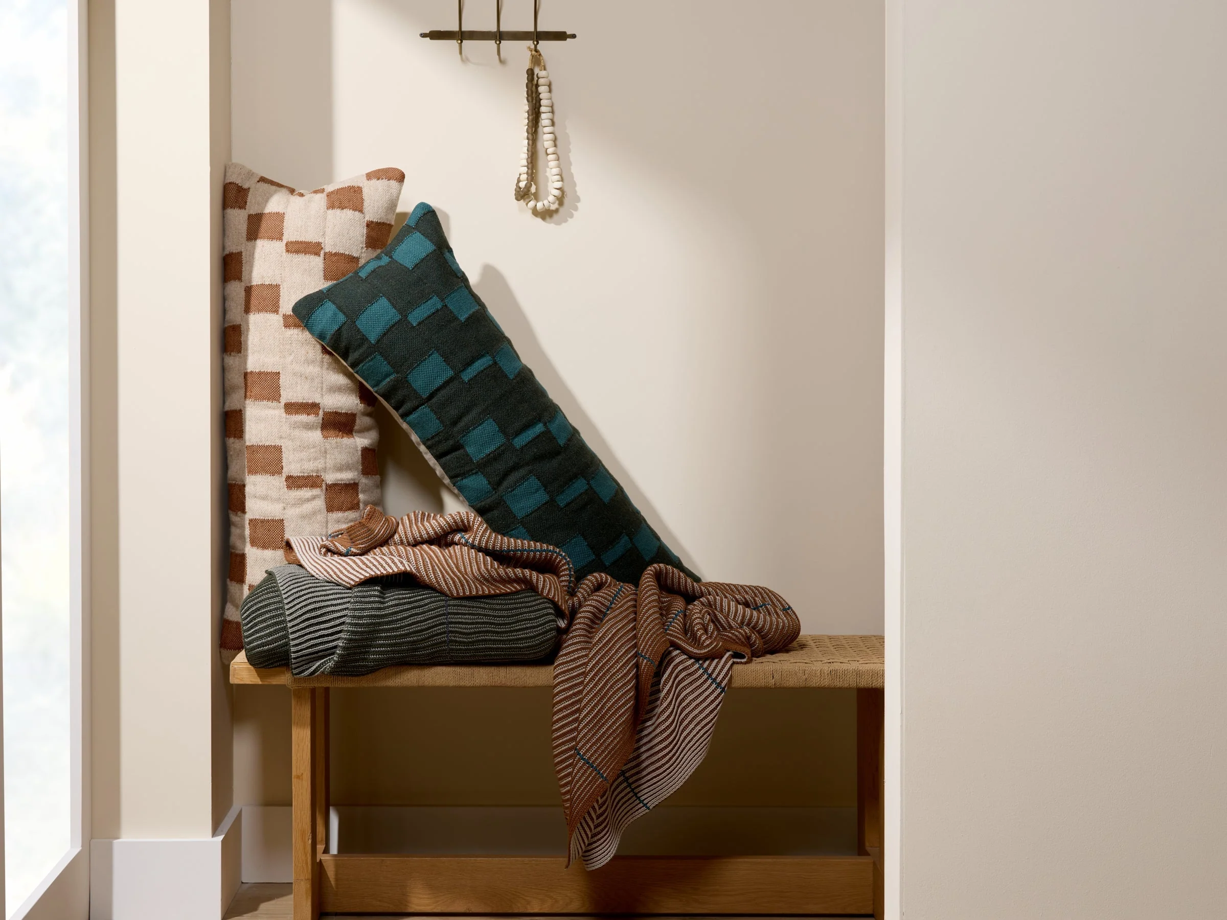 Feels collected, considered, and right at home. With its dimensional wool weave, modern check-inspired motif and earthy palette, this piece brings a well-traveled, curated energy to your bed, bench, or sofa. Pair with other jacquards for a maximalist moment or with solids for a simple, grounded statement.